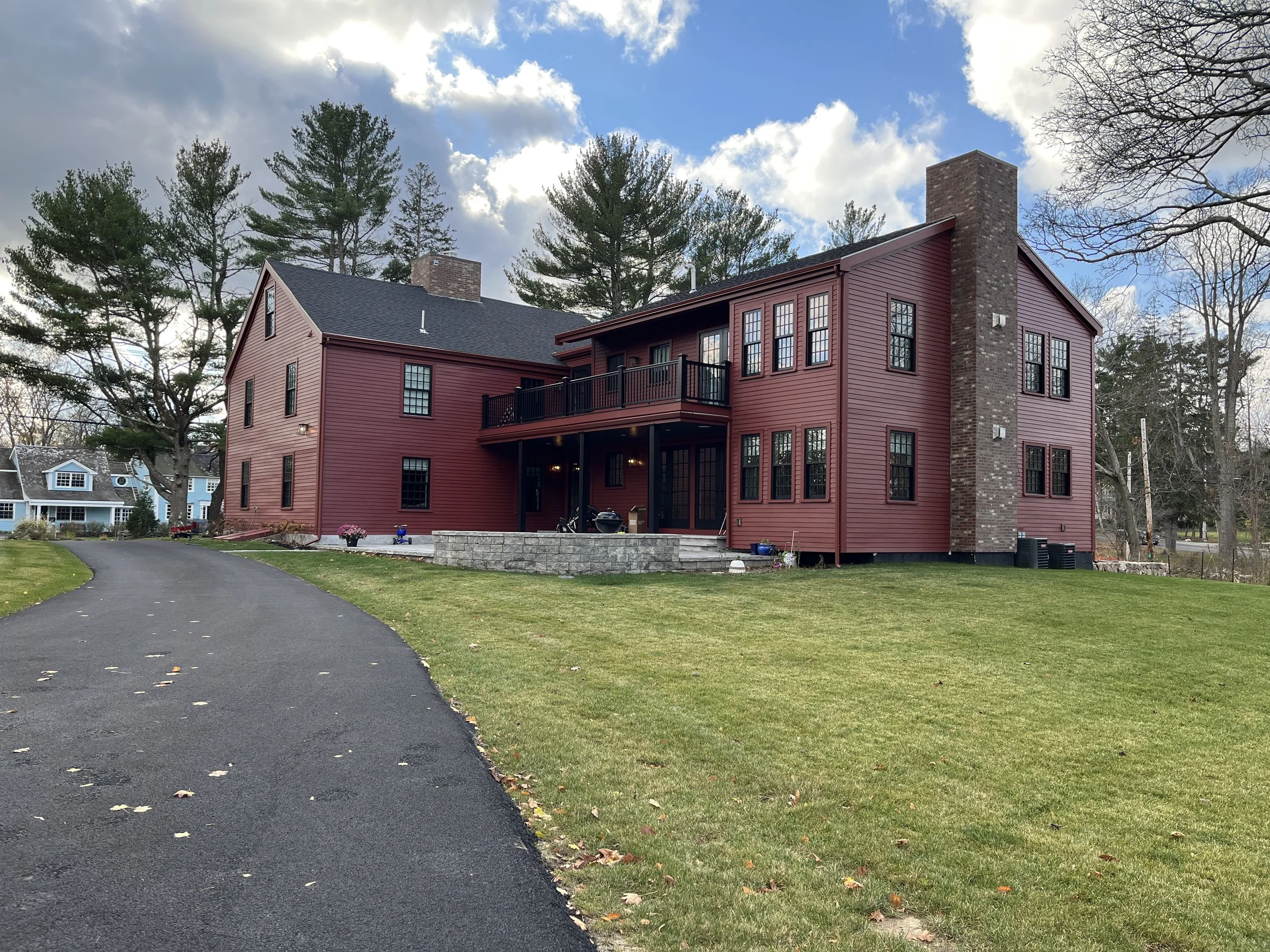 This antique colonial farmhouse got a second lease on life with a major remodel, followed by an updated landscape with rustic features and modern functionality. The outdoor grill area connects the dining and lounging patio to the fire pit space with the texture and pattern of reclaimed granite slabs. Granite benches surround the reclaimed granite fire pit. Curving and rolling stone walls connect the living spaces to the lawn and plantings.